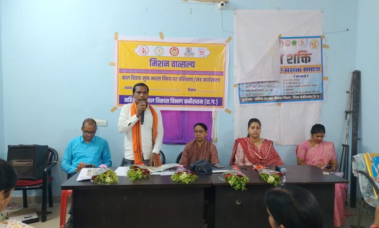कवर्धा, 30 मार्च 2026। ‘‘बाल विवाह मुक्त भारत/छत्तीसगढ़ अभियान‘‘ के प्रभावी क्रियान्वयन के लिए जनपद पंचायत सभाकक्ष कवर्धा में एक दिवसीय कार्यशाला सह प्रशिक्षण कार्यक्रम का आयोजन किया गया। यह अभियान मुख्यमंत्री श्री विष्णुदेव साय द्वारा 10 मार्च 2024 से प्रारंभ किया गया है, जिसका उद्देश्य समाज से बाल विवाह जैसी कुप्रथा का पूर्ण उन्मूलन करना है। कार्यक्रम में बताया गया कि बाल विवाह केवल एक सामाजिक बुराई ही नहीं, बल्कि कानूनन अपराध भी है। इससे बच्चों के सर्वांगीण विकास पर प्रतिकूल प्रभाव पड़ता है तथा विशेष रूप से बालिकाओं की शिक्षा बाधित होती है। साथ ही यह बच्चों के अधिकारों का हनन भी है। इस बुराई के उन्मूलन हेतु समाज के प्रत्येक वर्ग की सक्रिय भागीदारी आवश्यक है। कार्यशाला में नगर पालिका परिषद कवर्धा के सभापति श्री बिहारी धुर्वे, जिला कार्यक्रम अधिकारी, जिला महिला एवं बाल विकास अधिकारी, जिला बाल संरक्षण अधिकारी सहित संबंधित विभागों के अधिकारी उपस्थित रहे। इसके अलावा एकीकृत बाल विकास सेवा परियोजना कवर्धा एवं दशरंगपुर के परियोजना अधिकारी, विकासखंड कवर्धा के अंतर्गत पर्यवेक्षक, सरपंच, सचिव, शिक्षक, रोजगार सहायक, राज्य ग्रामीण आजीविका मिशन (बिहान) के ब्लॉक समन्वयक, आंगनबाड़ी कार्यकर्ता, मितानिन, जिला बाल संरक्षण इकाई एवं चाइल्ड हेल्पलाइन टीम के सदस्य भी शामिल हुए। कार्यक्रम में उपस्थित सभी प्रतिभागियों को बाल विवाह की रोकथाम हेतु जागरूक किया गया तथा किसी भी प्रकार की सूचना मिलने पर टोल फ्री नंबर 1098 (चाइल्ड हेल्पलाइन) पर सूचित करने की अपील की गई